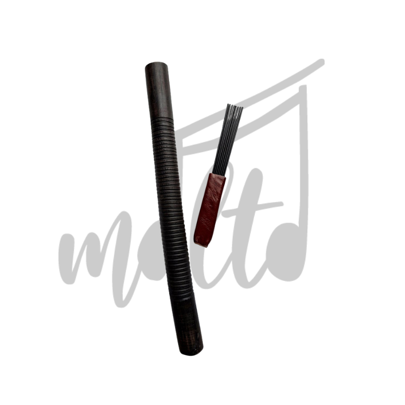 Incluye trinche o tenedor en acero con mango en cuero, diseñado para lograr una ejecución cómoda y producir el sonido distintivo al raspar la superficie del instrumento.